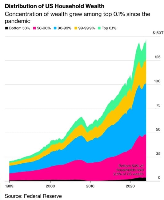 You can see the effect: in the 45 years since, income for the majority of Americans (the workers) has barely shifted, whereas the income for the top 20% has sky-rocketed. If you further separate out the top 1% and 0.1% (which is still 3.5M and 350,000 people) you need a larger page to see the top of the graph. Instead I’ll add another graph that shows the distribution of wealth in the US. That small black stain at the bottom: that is the bottom half of US households i.e. 175 million people.